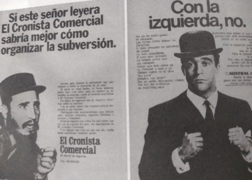 La propaganda (que figura en la tapa del libro) de Austral juguetea con la idea de una azafata diciendo que «a lo sumo podrá sostener la bandeja con la mano izquierda pero atenderá con la derecha «sino avise se nos filtró una zurda» era la proclama; otra muestra que ofrece el libro es el aviso de El Cronista con la imagen de Fidel Casrto (ver abajo).