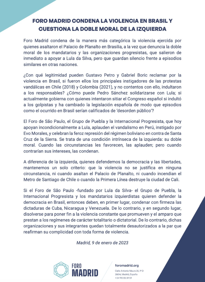 Mientras José Luis Espert condenó sin recurrir a «peros» el intento de desestabilización de bolsonaristas en Brasilia; Javier Milei se remitió a un comunicado de El Foro de Madrid que alude a una «doble vara», y si bien desliza una critica a lo ocurrido en Brasil, considera que la misma posición debería tenerse respecto a los actuales presidentes Gabriel Boric y Gustavo Petro a los que califica como «instigadores de los hechos vandálicos sucedidos en Chile (2018) y Colombia (2021), respectivamente», y al de España, Pedro Sáncher por «gobernar con quienes pretendieron cerrar el Congreso».