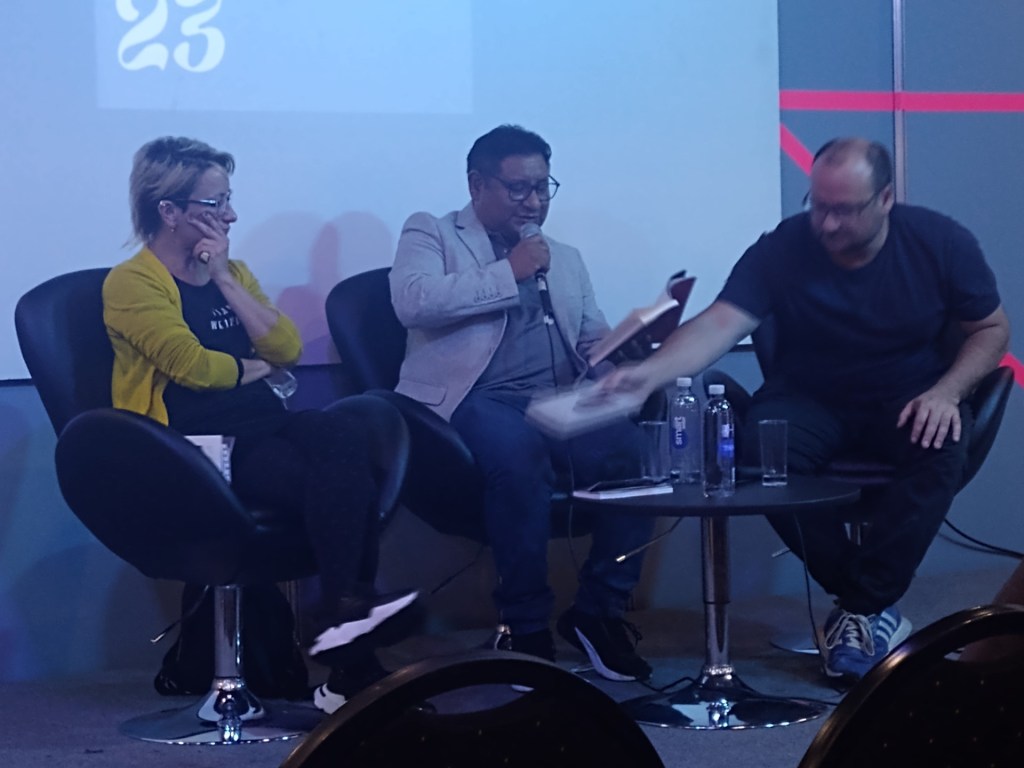 Un memento especial fue la charla de Martín Caparrós en la presentación de su «biblioteca» en la que acompañado de una proyección sobre momentos de su vida hizo un racconto desde sus primeros libros Ansay o los infortunios de la gloria y No velas a tus muertos, pasando por el monumental trabajo La Historia, sus libros sobre Crónicas de viaje, el imprevisible Boquita y las biografías noveladas de Echeverría y Sarmiento.