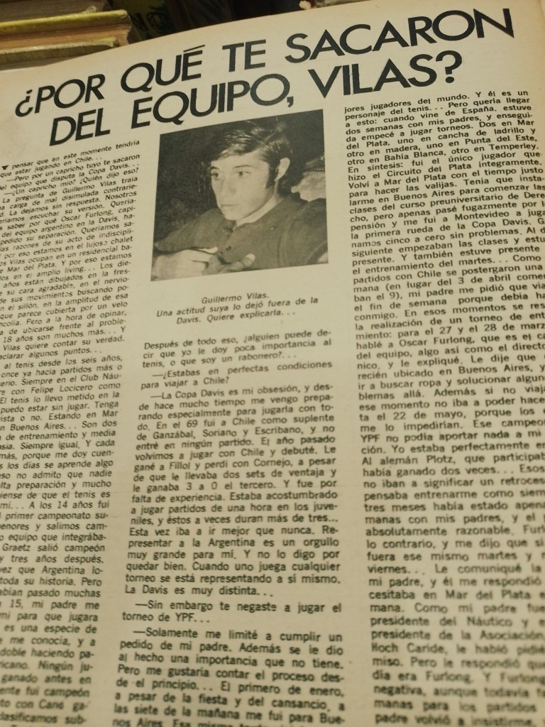 Distinto sería al mes siguiente. La Argentina debía disputar frente a Chile las semifinales de la Zona Americana, Furlong dispuso que diez días antes se disputara una especie de certamen de entrenamiento en el club YPF, pero Vilas se negó a participar («estaba por radicarme en Buenos Aires para continuar con los estudios en la Facultad y decidí regresar a Mar del Plata a buscar ropa, libros y mis certificados de estudios», fue su argumento) y propuso sumarse el fin de semana anterior al match ante los trasandinos; mas el capitán no contempló la situación y lo excluyó del equipo.