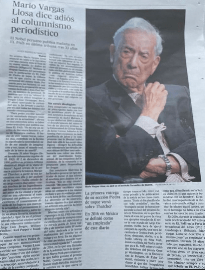 El reciente 17 de diciembre se publicó la que, según el propio Mario Vargas Llosa, fue su última columna periodística. Así lo había destacado el día anterior, su hijo Alvaro, con éstas palabras: «Como anuncia “El País”, mi padre pone punto final a su trayectoria como columnista de opinión. Mañana saldrá su última “Piedra de toque”, que se publica en dicho diario de España y otros lugares del mundo desde 1990, y había existido antes, desde 1977 y por unos años, en el Perú. Chapeau, MVLL».