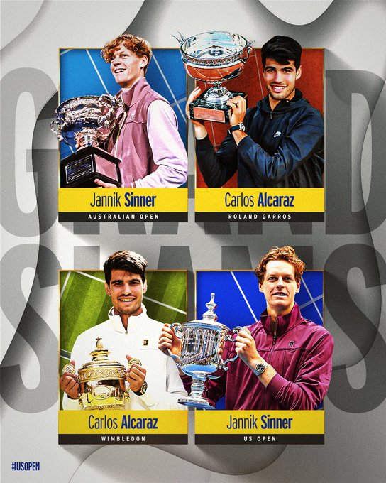 Al imponerse ayer en la final del USOpen, ante el local Taylor Fritz, el italiano Janik Sinner, conservó el número 1 del mundo y obtuvo su segundo título de Grand Slam, ambos éste año (el primero fue el Australian Open); en tanto Carlos Alcaraz había conseguido el otro par de Majors de esta temporada: Roland Garros y Wimbledon.