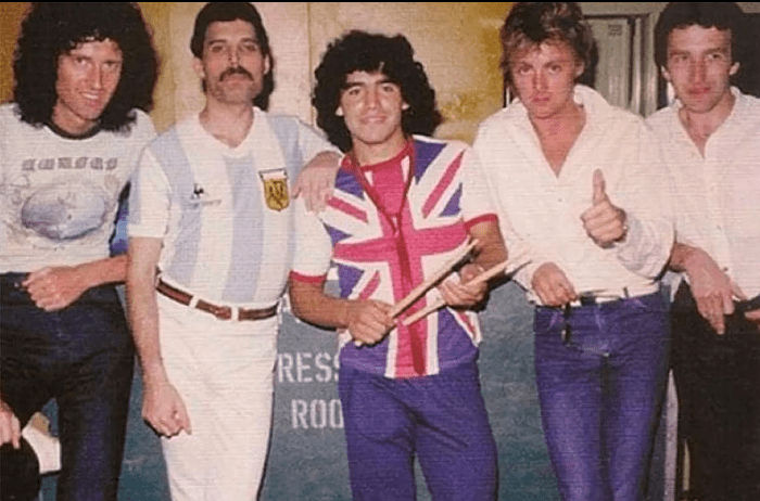 El 10 se puso la camiseta con los colores de la bandera británica y Freddie la de la selección argentina. Faltaba más de un año para el conflicto bélico por Malvinas.