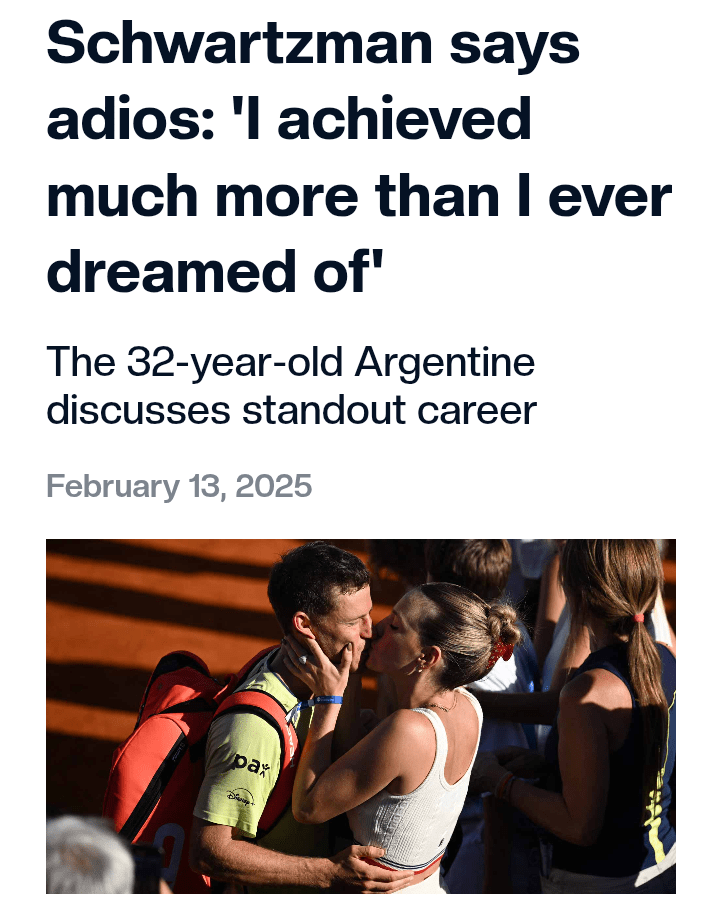 «Logré mucho más de lo que jamás soñé», afirmó Schwartzman que a los 32 años dijo adiós al tenis profesional dejando como legado en resultados una semifinal de Roland Garoos, final del ATP de Roma, participante del Torneo de Maestros en 2020 y con cuatro ATP en su haber. Pero sobre todo, dejó el ejemplo de que no hay barreras ni de altura, ni de potencia, capaces de frenar un sueño.