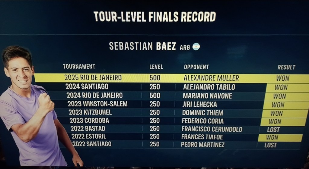 Ya en la final frente a Muller (que venía de eliminar a los finalistas del Argentina Open, el local Joao Fonseca dando un batacazo, y sorpresivamente a Francisco Cerúndolo) a Baez se lo vió aplomado desde el inicio. El juego de su rival, parecía «calzarle» justo al argentino, dada la volatilidad del galo, que juega un tenis muchas veces tentativo, ante un jugador sólido como el a la postre campeón.