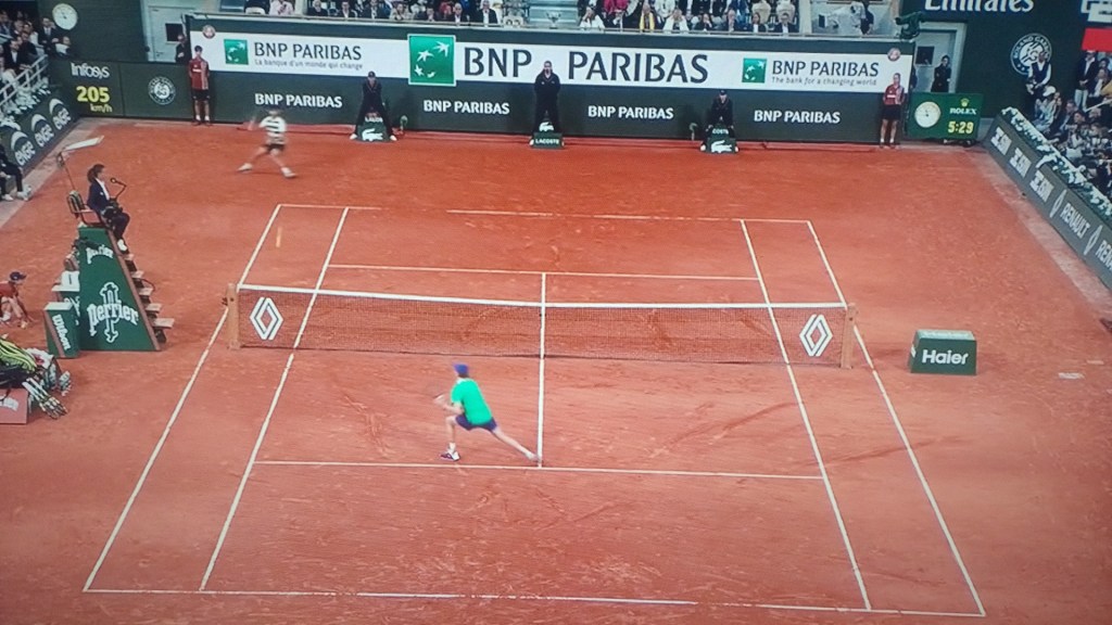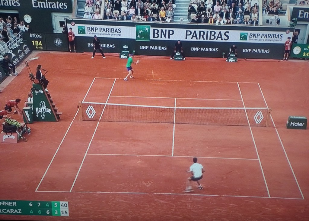Entre paréntesis es impactante escuchar el impacto de la pelota, tanto el del italiano cuando distribuye el juego, como de Alcaraz cuando llega a la bola y lanza las réplicas. Ambos con muy buen drive, Alcaraz quizá con mejor revés y Sinner un saque un poco más determinante. De todos modos, no es demasiado útil pasar revista a cada golpe de manera individual, sino que son parte de un esquema de juego.