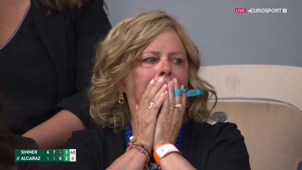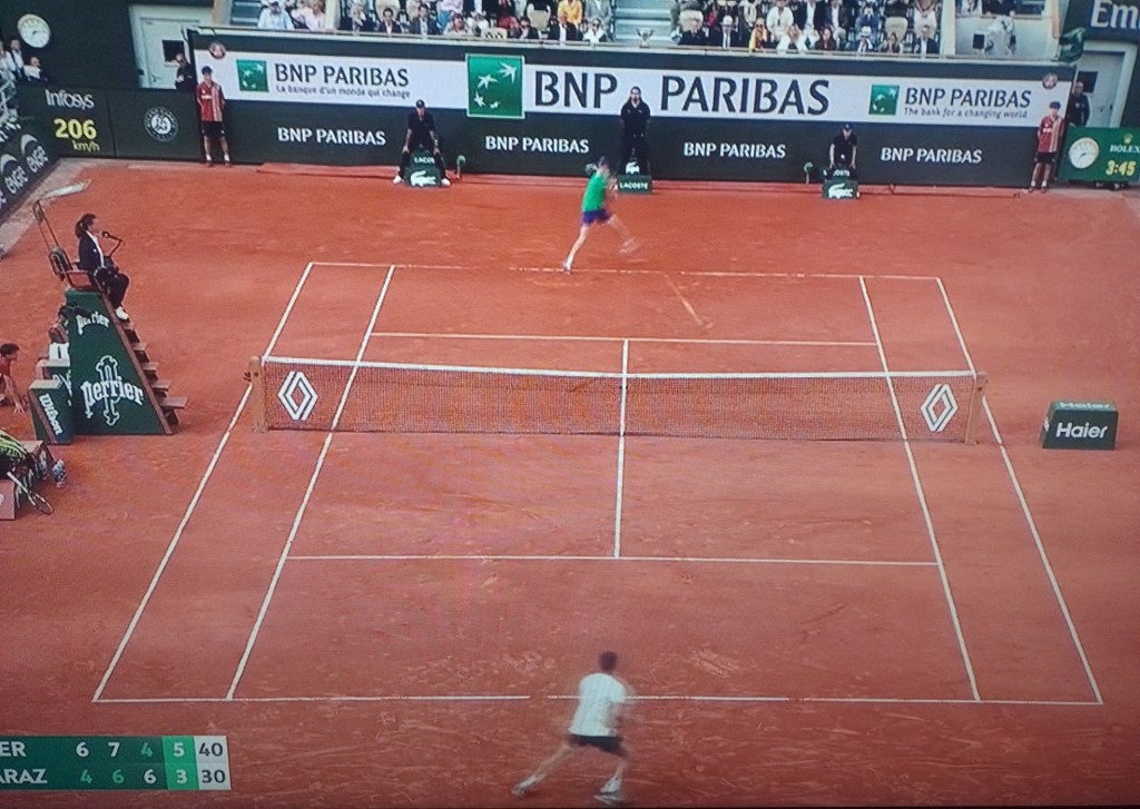 En el primer match point (ver foto de abajo) Sinner devolvió largo un segundo saque de Alcaraz.